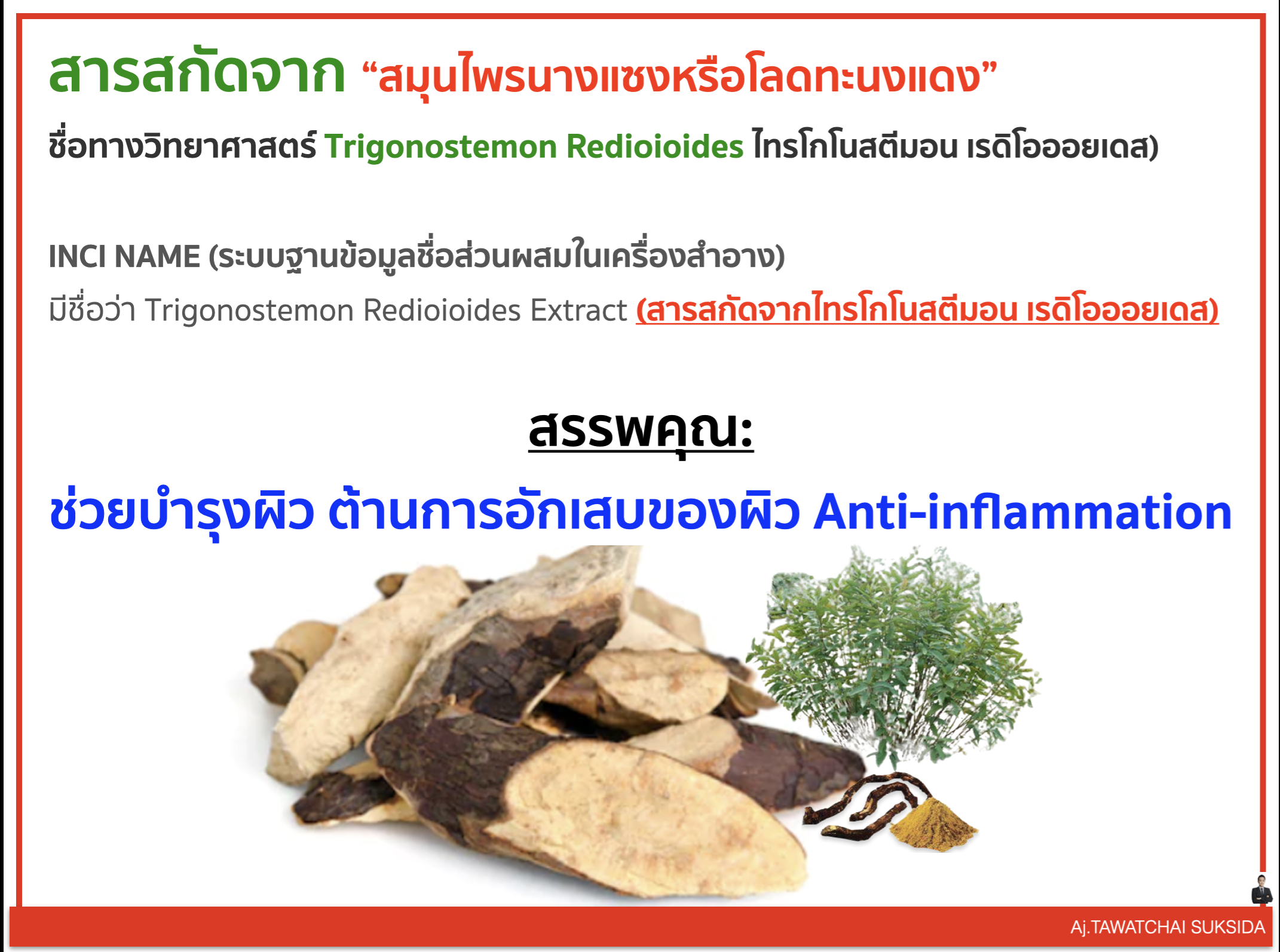 INCI NAME (ระบบฐานข้อมูลชื่อส่วนผสมในเครื่องสำอาง) มีชื่อว่า Trigonostemon Redioioides Extract (สารสกัดจากไทรโกโนสตีมอน เรดิโอออยเดส)