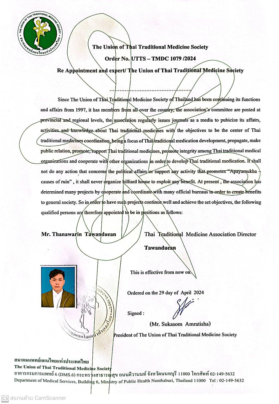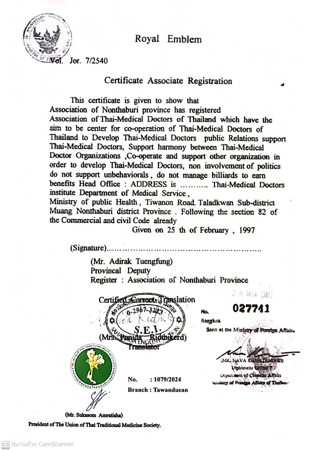 ให้ไว้ ณ วันที่ 29 เมษายน 2567 สมาคมแพทย์แผนไทยแห่งประเทศไทย